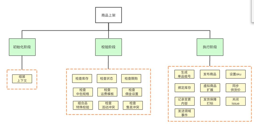 3. 产生报告的时间太晚,无法采取有效措施。这种结构化的表达,很明显让问题的表述更加清晰。领导也可以很快抓住问题的要点,并作出相应的决策。当然,这里是为了着重介绍归类分组,真正的汇报你还要提供对应的解决方案,然后让老板做“选择题”。你遇到一个相当复杂的业务场景,在这个业务操作中,涉及到大量的校验和执行操作。这种代码,如果没有一定的策略,很容易写成大泥球。例如,在我们的业务中有一个商品上架的操作,是一个非常复杂的业务操作。对这种业务问题的分解,通常是产品经理的职责,但是作为工程师也不能完全依赖PRD。因为产品视角和工程视角还是有差别的。同样,在分解之后,我们需要有一个归类分组的过程。否则,这些步骤的平铺会让代码显得凌乱,不方便记忆和维护。通过分析,我们可以把分解后的步骤分成三个阶段:最后,我们按照这个结构去组织我们的代码,整个代码结构会更加清晰,代码的可维护性也会好很多。